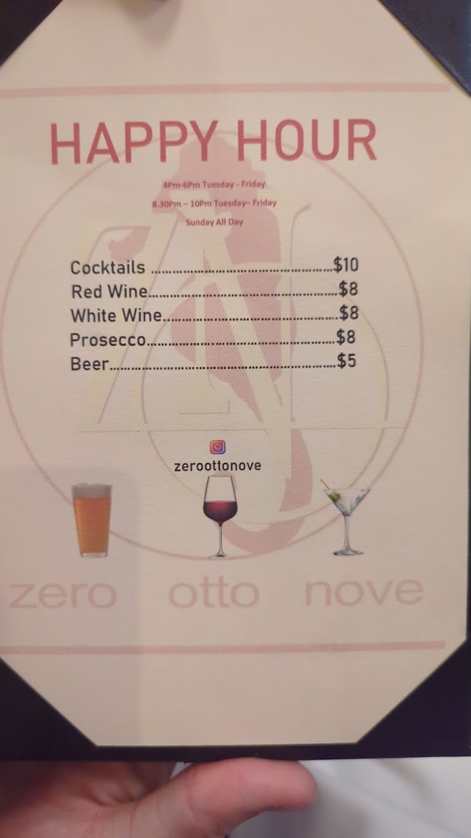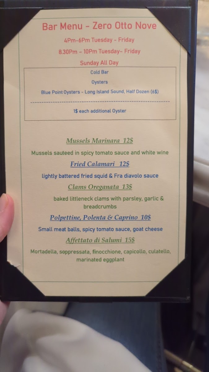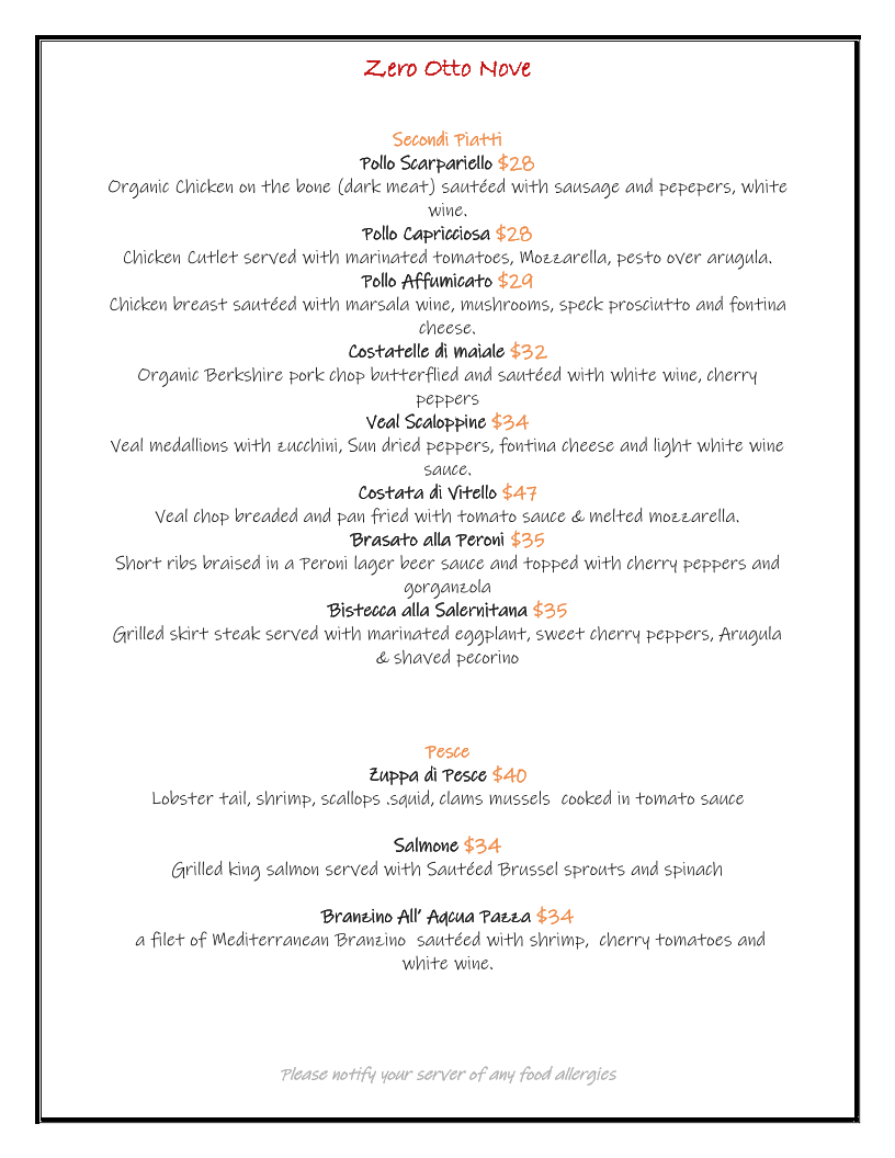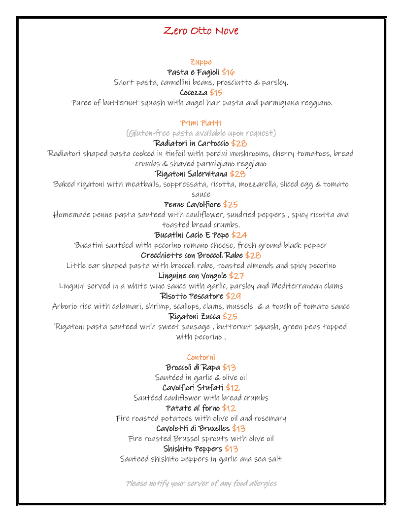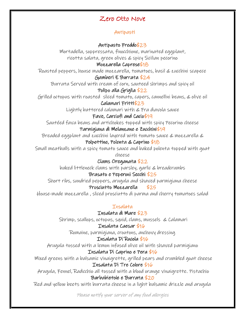 The menu at Zero Otto Nove Tuckahoe offers a delightful variety of Italian-inspired dishes that will satisfy every palate. Starting with the antipasti, guests can enjoy flavorful options such as Antipasto Freddo, Mozzarella Caprese, and Gamberi E Burrata, or opt for the Polipo alla Griglia and Calamari Fritti. The salads are equally diverse, with choices like Insalata di Mare, Insalata Caesar, and the unique Insalata Di Caprino e Pera. For a warm start, the Pasta e Fagioli and Cocozza soups are comforting and hearty.